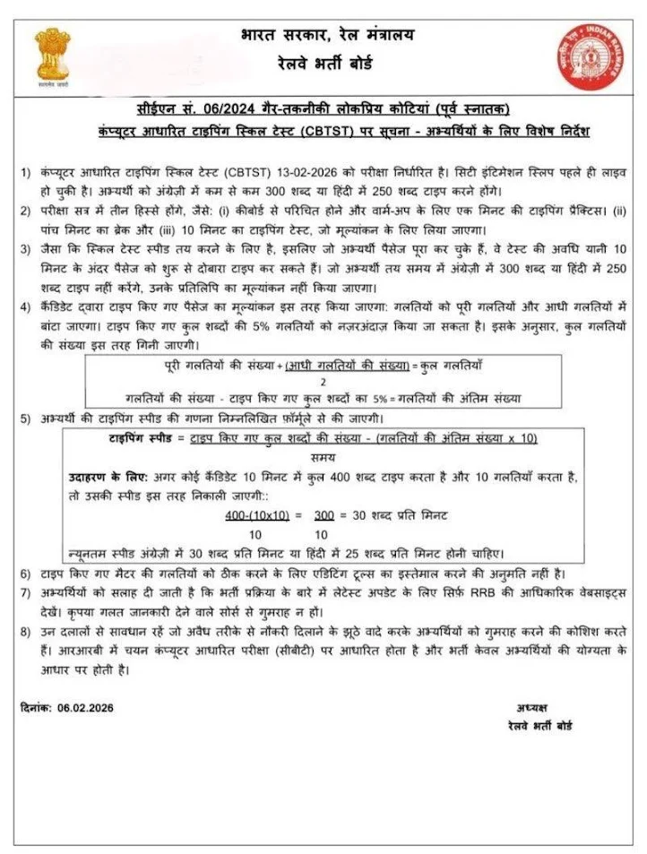 The latest instructions released by RRB for the typing test include guidelines such as typing speed requirements, errors allowed, and more. Given below are the details: