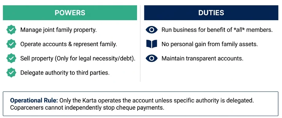 - Karta can delegate authority; co-parceners cannot halt cheque payments – While the Karta may authorize someone to manage transactions, co-parceners do not have independent authority to stop payments.