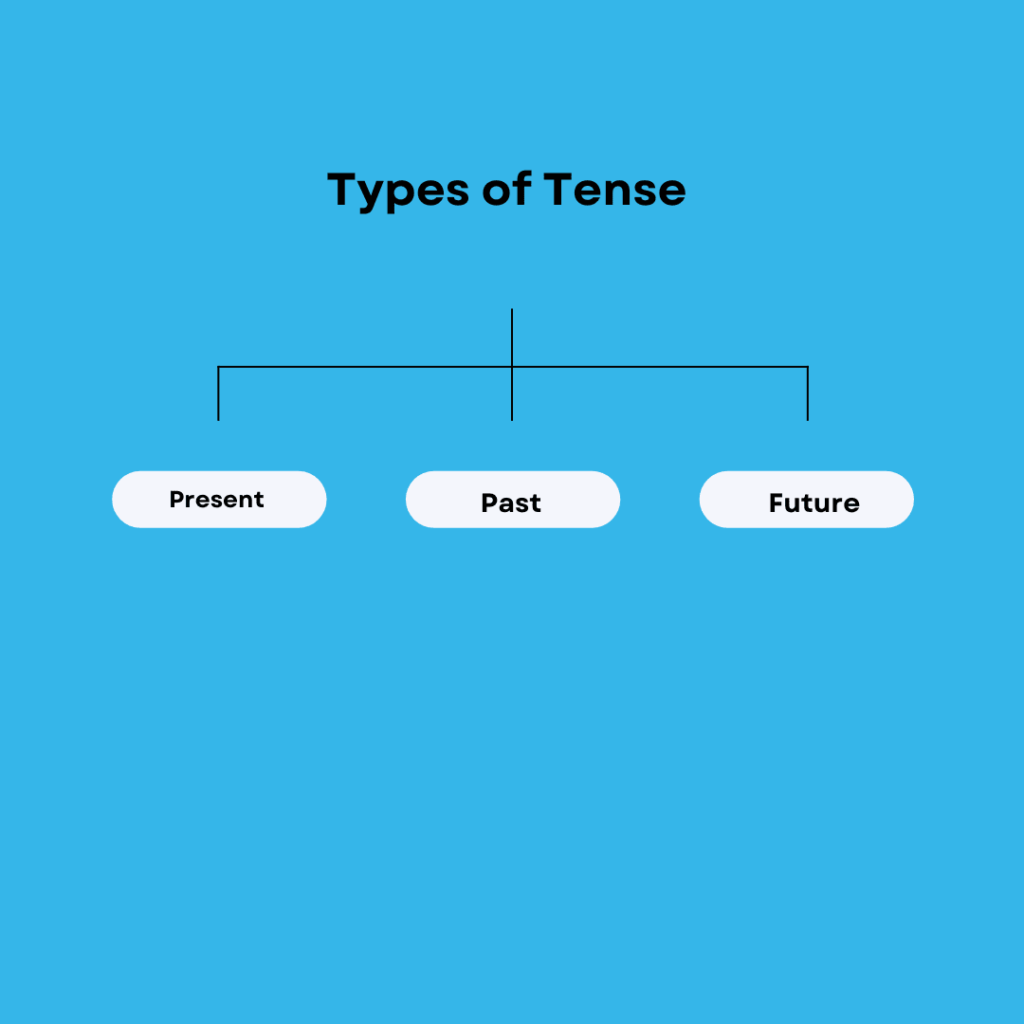 Ans. The three types on tenses in English are Present tense, Past tense, Future tense.