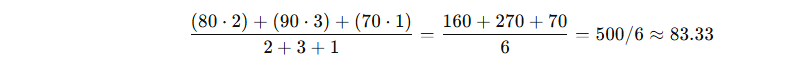| Weighted average | Multiply each value by its weight, divide by total weight |