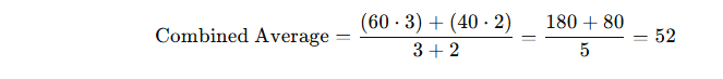 | Find the combined average of 2 groups | Use direct sum ÷ total numbers |