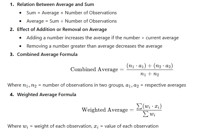 - Memorise formulas for combined average, weighted average, and missing number problems