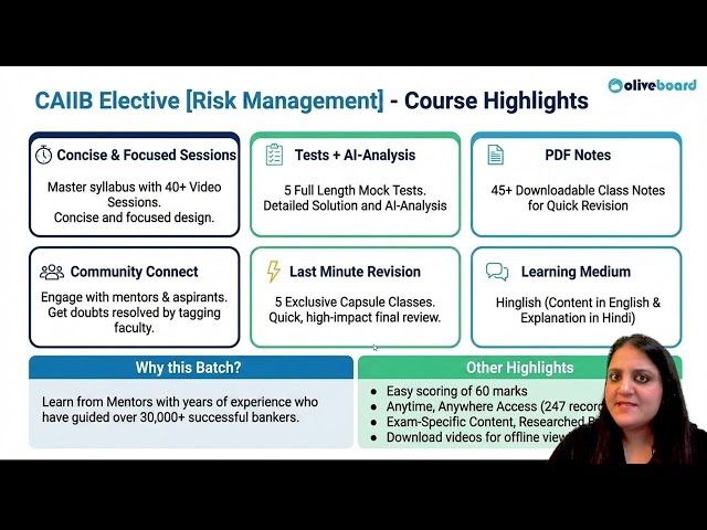 • Concise & Focused Sessions Master the CAIIB Elective [Risk Management] syllabus with 40+ Video Sessions designed to be both concise and focused
