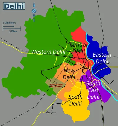 दिल्ली केंद्र शासित प्रदेश का मानचित्र, जिसमें नई दिल्ली, उत्तरी दिल्ली, दक्षिणी दिल्ली, पूर्वी दिल्ली और पश्चिमी दिल्ली के प्रमुख क्षेत्र व सीमाएँ दर्शाई गई हैं।