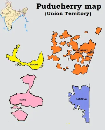पुदुच्चेरी केंद्र शासित प्रदेश का मानचित्र, जिसमें पुदुच्चेरी, कराईकल, माहे और यनम के चार क्षेत्रों का स्थान भारत के दक्षिणी भाग में दर्शाया गया है।