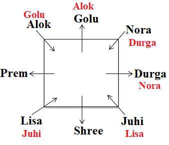 Directions :Eight persons Alok, Durga, Golu, Juhi, Lisa, Nora, Prem and Shree are sitting around the square table but not necessarily in the same order. Four persons are sitting at the corner of the table facing inside the centre while four persons are sitting on the middle side of the table facing outside the centre.