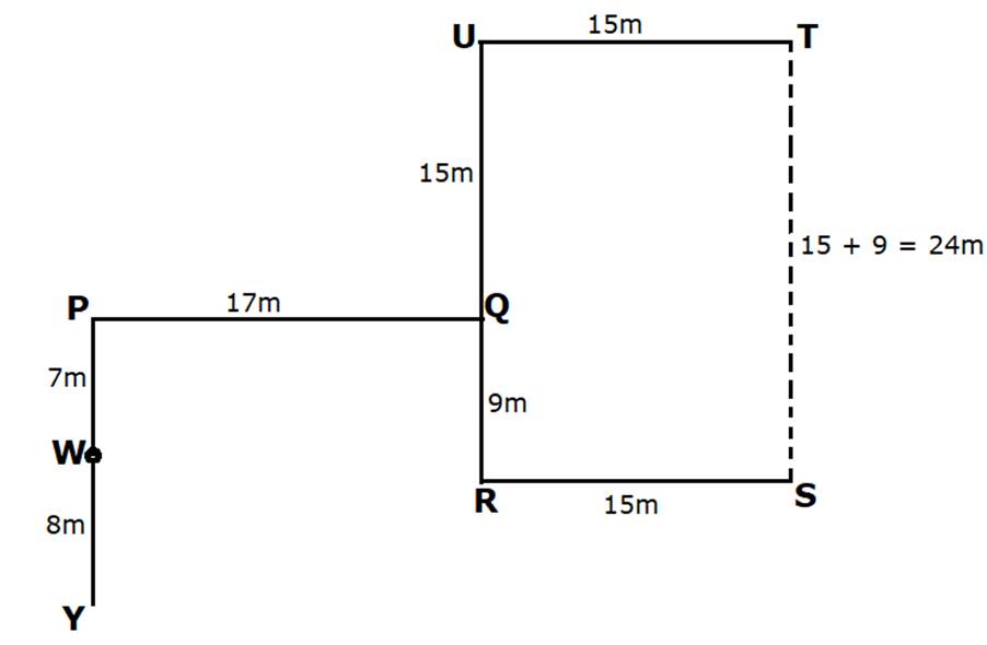 Directions [Set of 3 Questions]: Point S is 15m to the east of point R. Point Y is 8m to the south of point W. Point U is 15m to the west of point T. Point Q is 9m to the north of point R. Point P is 17m to the west of point Q. Point U is 15m to the north of point Q. Point W is 7m to the south of point P.