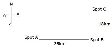 Spot A is 25km to the west of Spot B, which is 18km to the south of Spot C.