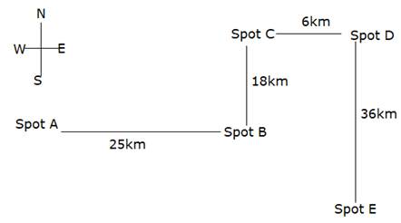 Spot D is 6km to the east of Spot C and 36km to the north of Spot E.