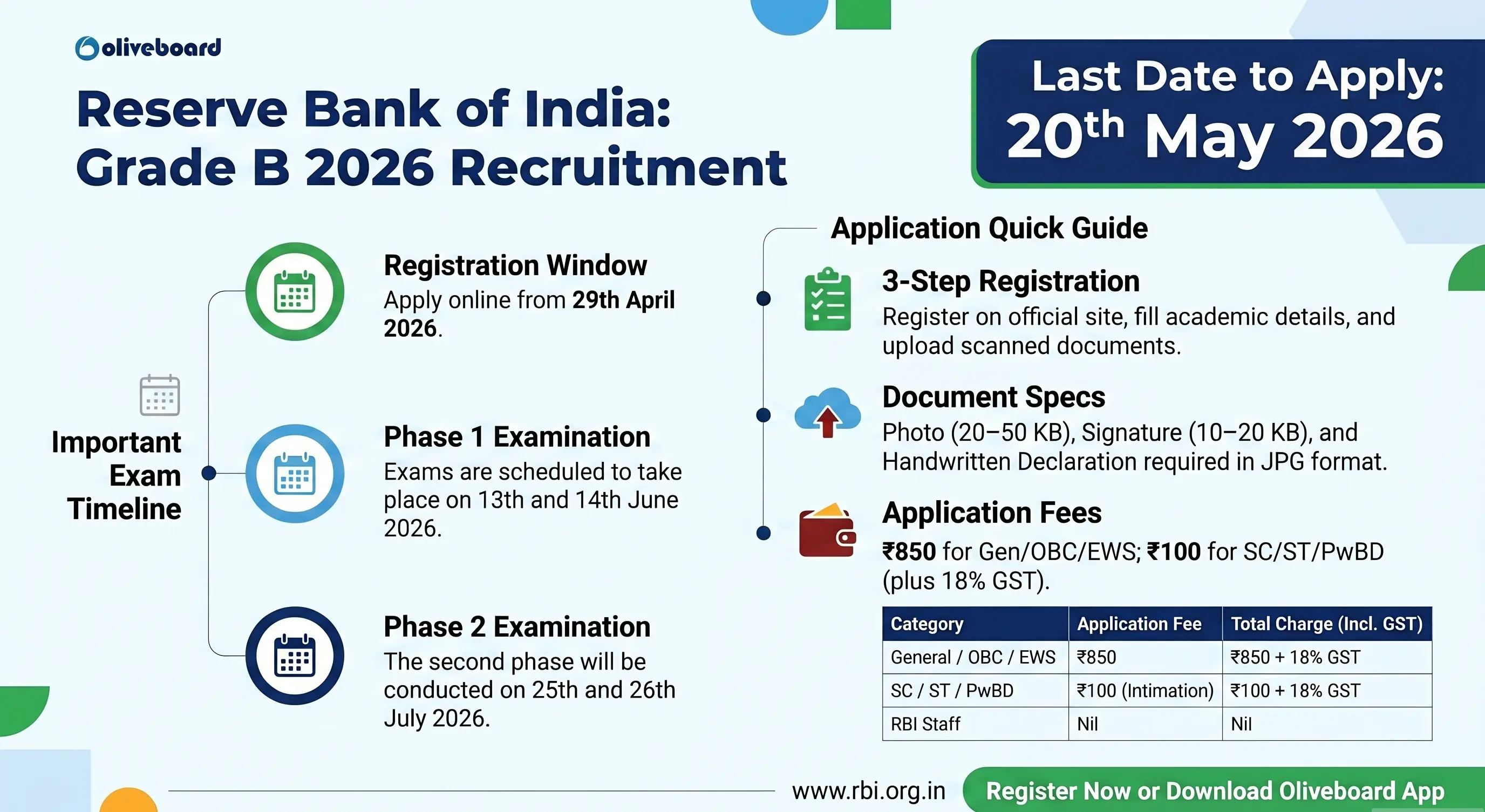 The RBI Grade B 2026 application process will start from tomorrow, 29th April 2026. Candidates will be able to apply online once the application link is activated on the official RBI website. The application window will remain open until 20th May 2026. During this period, candidates must complete registration, upload the required documents, and pay the application fee.